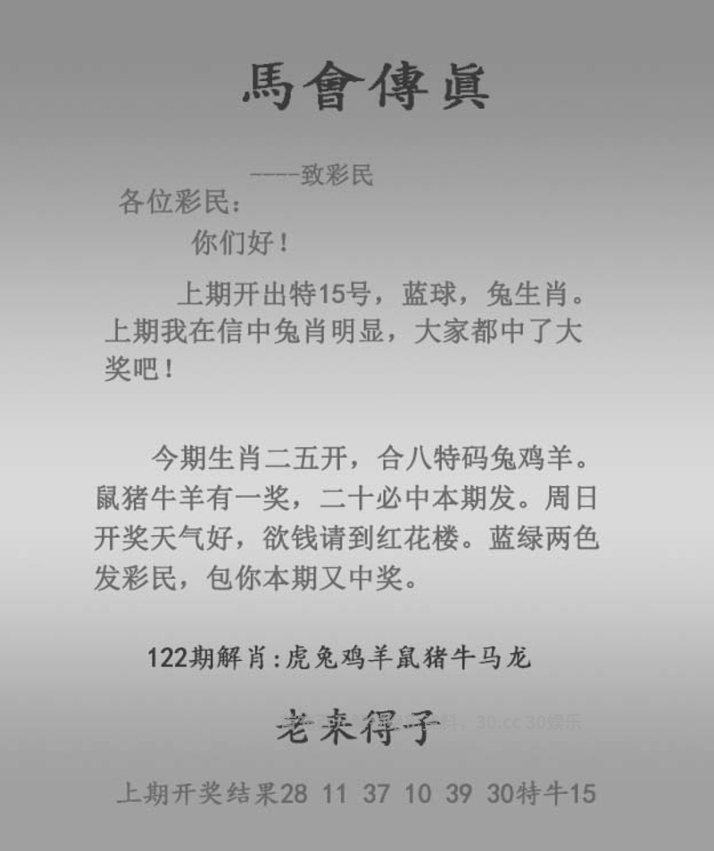 118期马会传真: 今期生肖看三五,马马虎虎来骗人 牛狗鸡马本期有,还有三二四零中 四六等于二十四,好码就从中间出 三一四二是何肖,不管三七二十一 乐在其中 解:今期牛狗鸡马本期有,解家禽生肖牛猪鸡羊狗马,四六等于二十四,解四头特码40-49 综合:狗马鼠猪猴羊牛蛇兔 六肖:狗马鼠猪猴羊 |